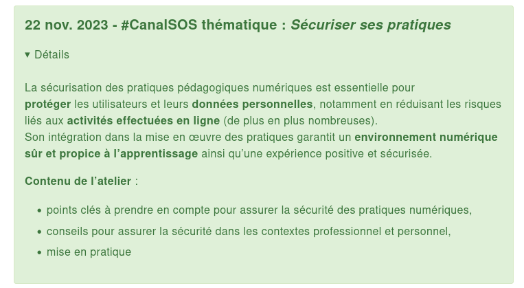 • un #CanalSOS thématique sur la sécurisation des pratiques - rdv mercredi 22 novembre de 14 à 16h